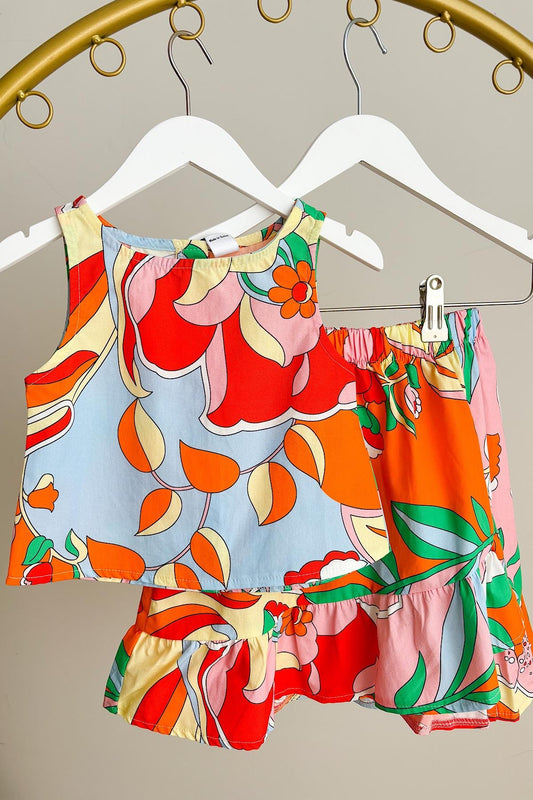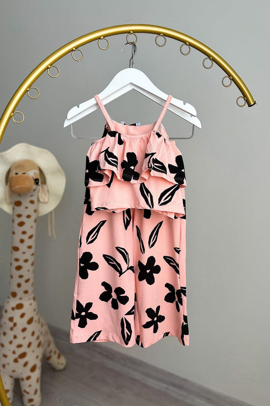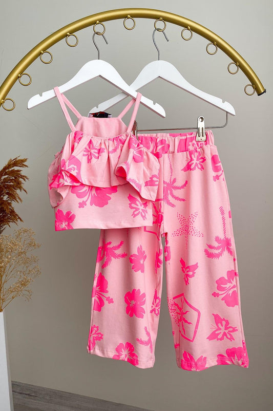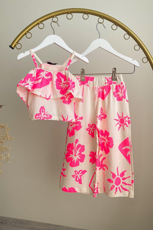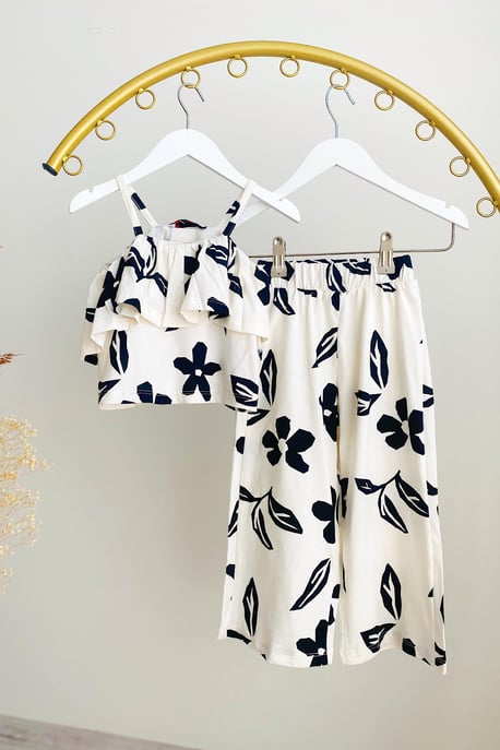 Kız Çocuk Çiçek Desenli Pamuklu Crop Takım