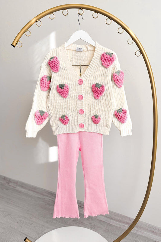 Kız Çocuk Çilek Aplikeli Triko Hırka Takım