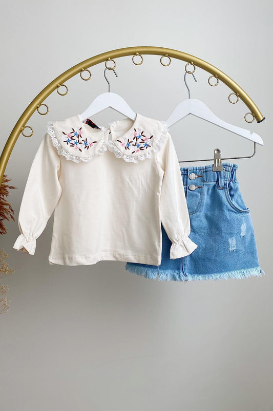 TükendiKız Çocuk Nakışlı Kot Etek Takım